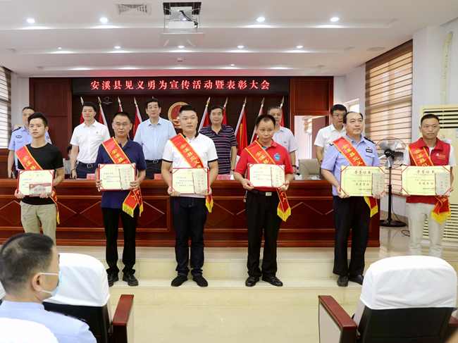 为倡导见义勇为,弘扬社会正气,积极培育和践行社会主义核心价值观,8月27日上午,安溪县见义勇为宣传活动暨表彰大会在湖头镇隆重召开。省“工委会”副主任、省见义勇为基金会会长傅镛堃,市见义勇为协会会长李永木,安溪县副县长、县公安局局长杜双路,湖头镇党委书记李瑞谦,安溪县委政法委副书记林志伟,县公安局党委委员、政工室主任陈木锋等有关领导出席会议。