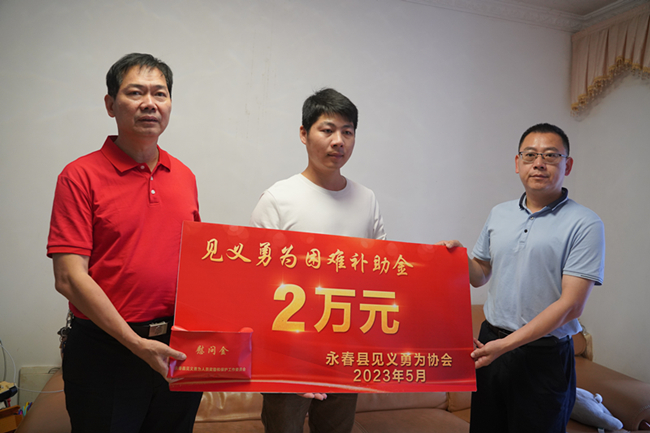 柳新群一行的到来,让何繁强欣喜万分。慰问中,柳新群一行亲切问候何繁强及其家人,查看了何繁强的家庭情况,并同永春县公安局政委王清木分别送上慰问金,把对见义勇为人员的关心关爱送入这家人的心中。