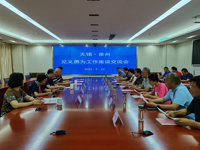 在随后召开的座谈会上,无锡市见义勇为基金会理事长王立人对泉州市见义勇为协会来锡学习交流表示欢迎,对泉州市许多工作创新思路、举措表示赞赏,同时详尽介绍了在党委政府领导和有关部门协同支持下,无锡见义勇为工作在顶层设计、体制机制建设以及发挥工作平台作用、形成见义勇为奖励和保护工作合力等情况,并希望两地继续加强合作交流、相互促进,共同营造浓厚见义勇为社会氛围。