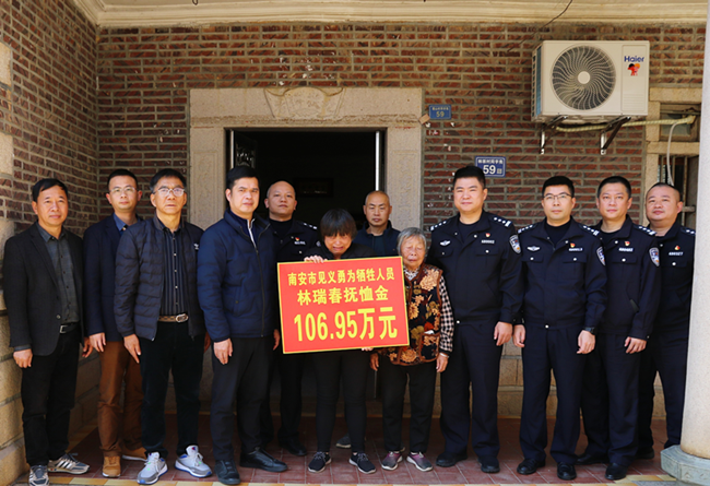 1月4日上午,南安市见义勇为工委会副主任、公安局政委王晓东在梅山镇党委书记陈贯明,公安局党委委员、政工室主任吴锦良,见义勇为协会会长王鼎南,梅山派出所所长黄湛嵘等领导陪同下前往梅山镇璞山村慰问见义勇为牺牲人员林瑞春家属,并发放抚恤金106.95万元。
