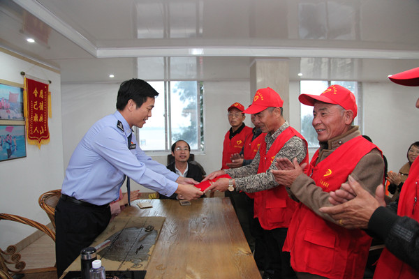 表彰仪式上,县见义勇为协会会长陈海防宣读了泉州市见义勇为人员奖励和保护工作委员会关于表彰泉州市见义勇为志愿者优秀集体的通报并送上慰问金,县局政委郑金阳为青山湾海上救护见义勇为志愿者服务队颁发了荣誉证书。