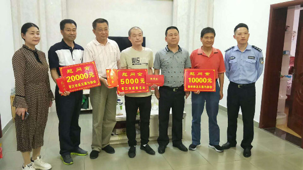 5月10日下午,泉州市见义勇为协会副会长吴良建、晋江市见义勇为协会会长陈永聪、晋江市见义勇为协会秘书长郑文约一行在乐平市公安局城南派出所领导、社区干部的陪同下,来到了洎阳街道观音泉社区的杨小华家中,亲手送上了共计3.5万元慰问金和晋江市人民政府赠送的见义勇为牌匾。
