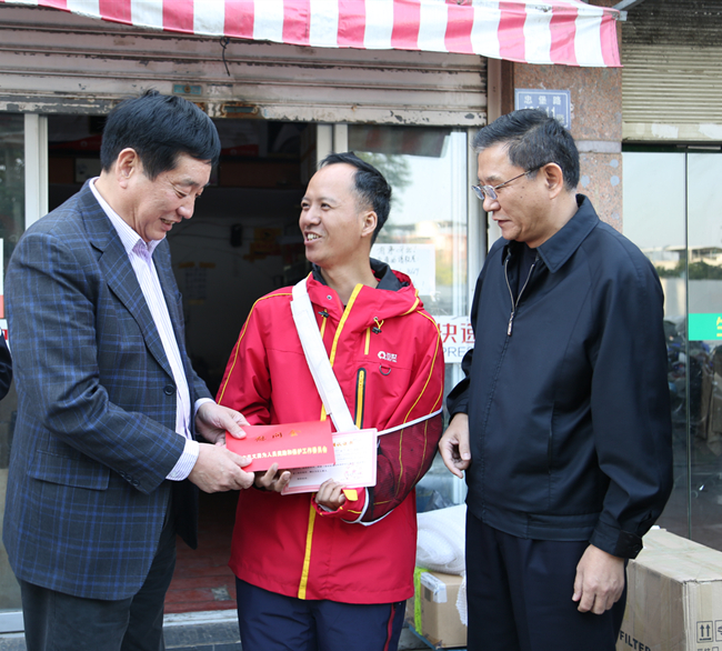3日下午,在“快递小哥”林海原的工作地,丰泽副区长、公安分局局长谢希圣亲手将见义勇为确认证书颁发给了林海原。这一刻,林海原露出了笑容,他紧紧握住谢局长的手说:“这是我应该做的,我是来自农村的。”谢希圣笑着回应:“我也是农民出身呀,感谢你为社会作贡献,这是正能量!”随后,谢局长又问起林海原的伤情恢复情况,当得知快要痊愈颇感欣慰,说道:“不枉我们花那么大力气赶赴贵州将违法人员抓获,现在白某强因故意伤害已被依法惩处,你好好安心工作,争取再创佳绩!”同行的泉州市见义勇为协会李永木会长及丰泽见义勇为协会分别送上慰问金1万元和2000元。