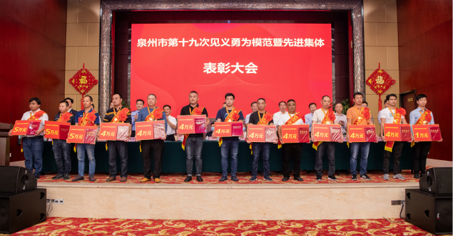 会前,与会领导亲切接见受表彰的见义勇为人员和见义勇为志愿者先进集体,并同大家合影留念。31名见义勇为人员、15个见义勇为先进工作站喜获奖励。市政府副秘书长、信访局长、市工委会副主任林强在会上宣读表彰决定,赖木辉等12人被市政府授予“泉州市见义勇为模范” 荣誉称号,黄守文等19人被市工委会评为泉州市见义勇为先进个人(群体),安溪湖头等15个见义勇为工作站被市工委会评为先进工作站。共颁发证书、奖章和奖金77.5万元。