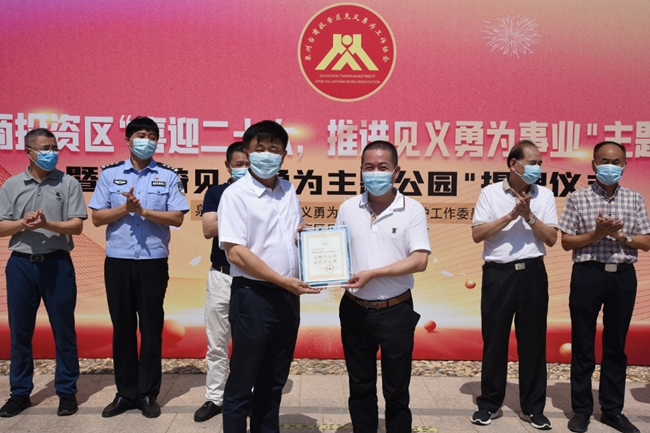 活动中,百崎乡郭炳森先生为见义勇为协会捐赠20万元,由区见义勇为人员奖励和保护工作委员会副主任邓志新接受捐赠。同时,聘请郭炳森先生为台商投资区见义勇为工作协会第二届荣誉副会长,由郑为太局长为其颁发聘任书;刘敏坚主任为其颁发纪念牌。随后,刘敏坚主任,吕良研、蔡永抽副会长,程碧民主任、郑为太局长、郭炳森先生共同为“百崎见义勇为主题公园”揭牌。