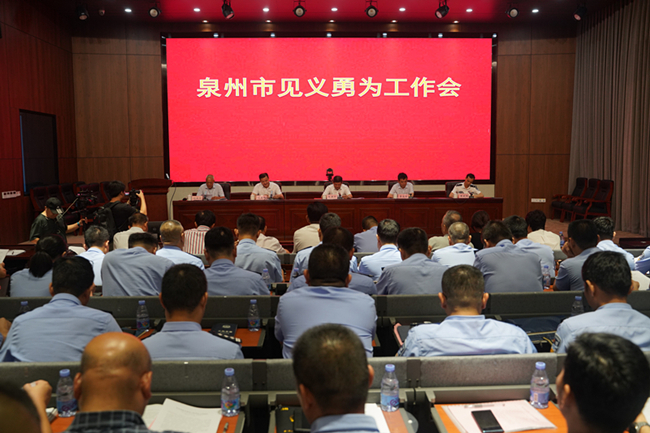 7月18日下午,泉州市见义勇为工作会在晋江市召开。泉州市副市长、公安局长、市见义勇为人员奖励和保护工作委员会主任肖进才,福建省见义勇为人员奖励和保护工作委员会副主任、省见义勇为基金会会长李应良,泉州市公安局副局长、晋江市副市长、公安局长黄建辉,泉州市见义勇为协会会长柳新群和各分、县(市)公安局政委、政工室主任,见义勇为(工作)协会会长参加会议。会议由泉州市公安局党委委员、政治部主任刘南辉主持。肖进才副市长在会上勉励市见义勇为协会要充分发挥主导牵引作用,各地协会要发挥主体主战作用,市县合力带领带动全市见义勇为工作者一起拼、一起干,推动我市见义勇为工作再上新台阶、取得新成效。