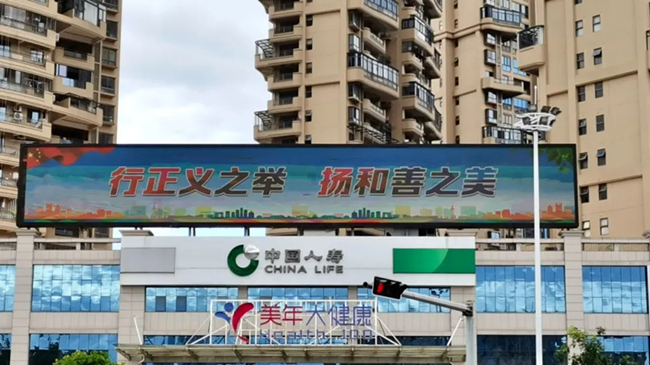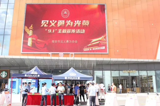 在主题LED大背景下面,在宣传展板面前,志愿者们热情地向过往群众发放着宣传单,传播着南安市见义勇为涌现的那些温暖的事情。