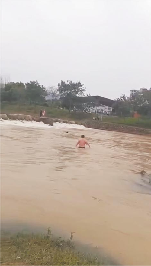 在群众提供的一段55秒的视频中显示:湍急的溪水中,隐约可以看到一大一小两个身影不停地挣扎,浮浮沉沉。岸边一名身材壮实的男子,穿着短裤,光着上身,朝水中两个身影方向走去……