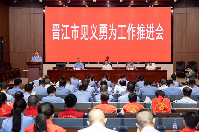 为进一步推进全市见义勇为工作持续健康发展,9月19日上午,晋江市召开见义勇为工作推进会暨业务培训会, 通过以会代训的形式促进全体见义勇为工作者业务水平的提升。福建省见义勇为基金会理事长李应良、泉州市见义勇为协会会长柳新群、晋江市公安局政委李勇、晋江市见义勇为协会各工作站站长及联络员等参加会议。