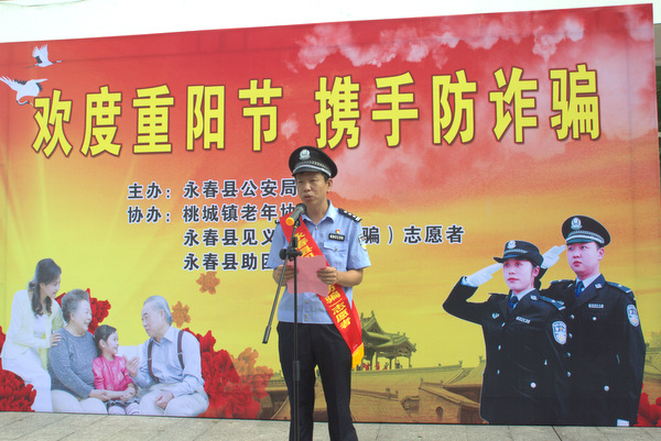 金秋送爽,丹桂飘香,一年一度的重阳节如期而至。为弘扬中华民族尊老、爱老、助老的传统美德,10月8日上午,永春县见义勇为(防骗)志愿者、永春县公安局、桃城镇老年协会等举行了一场别开生面的防骗宣传活动,为老年人送上了一份特别的重阳节礼物。