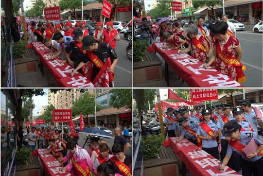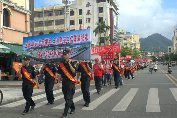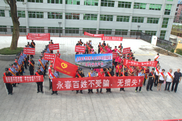 首先,防骗志愿者、县公安局刑侦大队、桃城派出所等一行100多人,开展宣传踩街活动。踩街队伍从桃城镇老年协会开始沿八角亭、城东街、大路头街到县光荣院,沿街开展宣传活动,沿路发放宣传单等。在城东街时代广场前,组织踩街人员、志愿者、路过群众等在“永春百姓不受骗、无损失”横幅上签名。
